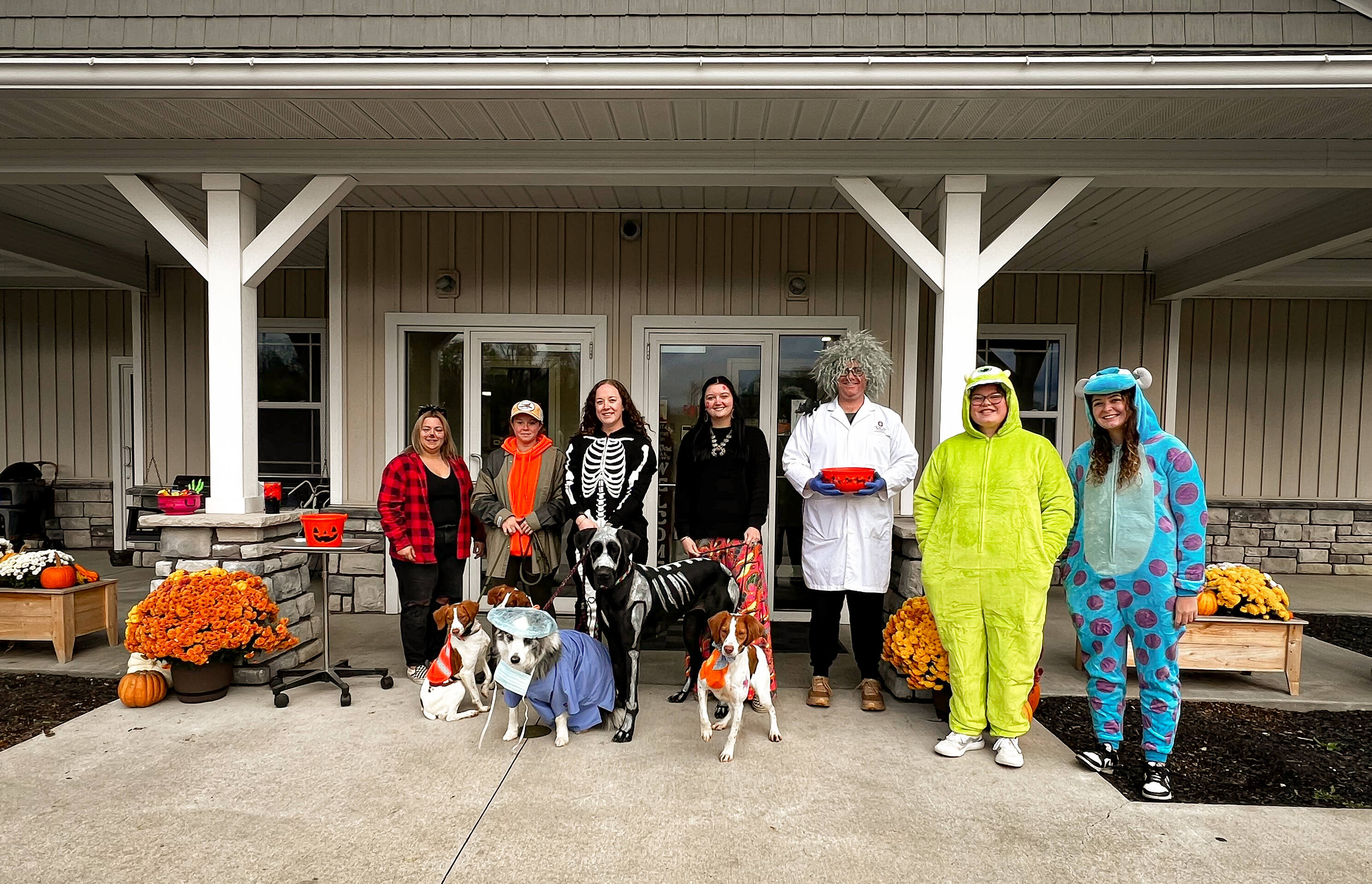 Staff gathered to pass put candy to Hopedale's youth! Staff members ranged from Doctors, CSR's, Managers, Technicians, Assistants, and staff pets! Costumes concluded a mad doctor, a cop and jailbird, mike and sully, a hippie, a skeleton, and a hunter! The clinic is hoping to keep this a yearly tradition!